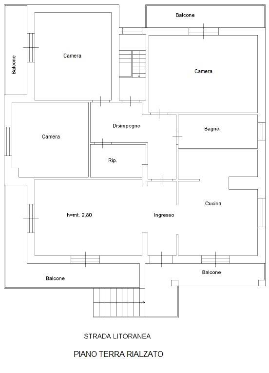 PTR: ingresso, salone doppio, cucina con tinello e termocamino, disimpegno, ripostiglio, 2 ampie camere, camera matrimoniale doppia, bagno, per un totale di 163 mq, e 4 balconi per un totale di 34 mq.